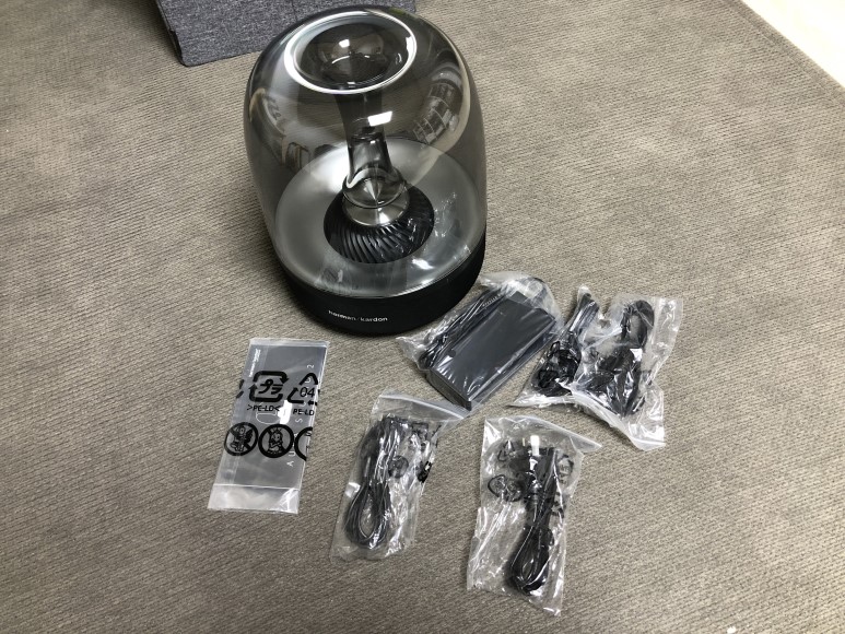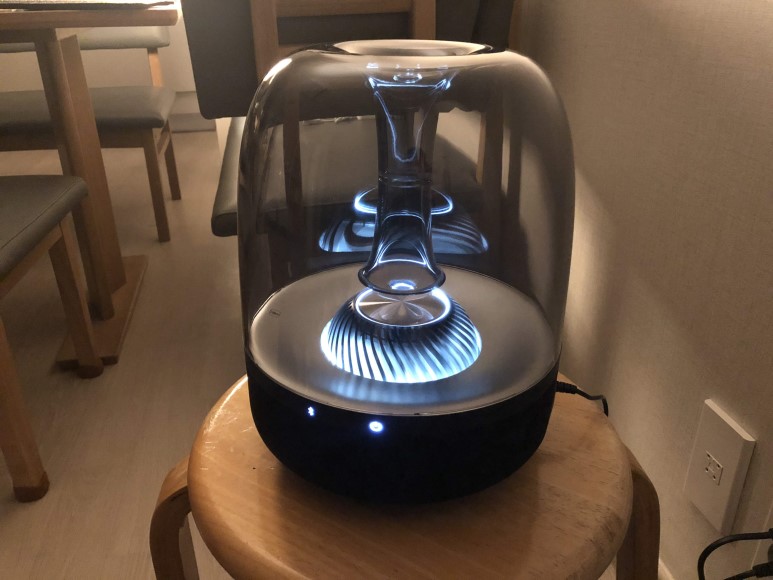 하만 카돈 오라 스튜디오 2는 인상 깊은 외형을 갖고 있습니다. 첫인상은 가습기처럼 생겼습니다. 밤에 불을 끄고 보면 수정구 느낌이 납니다. 핵심 부위는 검은 하판이며, 진공관처럼 생긴 부분이 울림통입니다. 검은 본체에 울림판이 붙었다고 생각하면 됩니다. 본체 바닥에는 손바닥 크기의 스피커가 있으며 옆부분에 나머지 스피커가 장착되어 있습니다. 진공관이라고 말씀드렸지만 '진공'은 아닙니다. 마치 아이스커피컵의 리드(뚜껑)처럼 생겼습니다. 위쪽 부분은 뚫려있습니다.