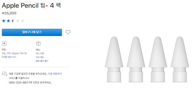 애플 펜슬의 펜촉은 소모품입니다. 때문에 처음 구매하면 여분의 펜촉을 제공합니다. 많이 사용하면 펜촉이 닳 수도 있습니다. 그런데 펜촉 4개에 25,000원이라뇨? 펜촉 끝 부분에 쇠구슬 같은 것이 있어 알 수 없는 이유로 작동한다고 합니다. 분실하거나 닳으면 새로 구매할 수 밖에 없습니다. 알리에서는 개당 3천원에 판다는 소문이 있으나 확인은 하지 않았습니다.