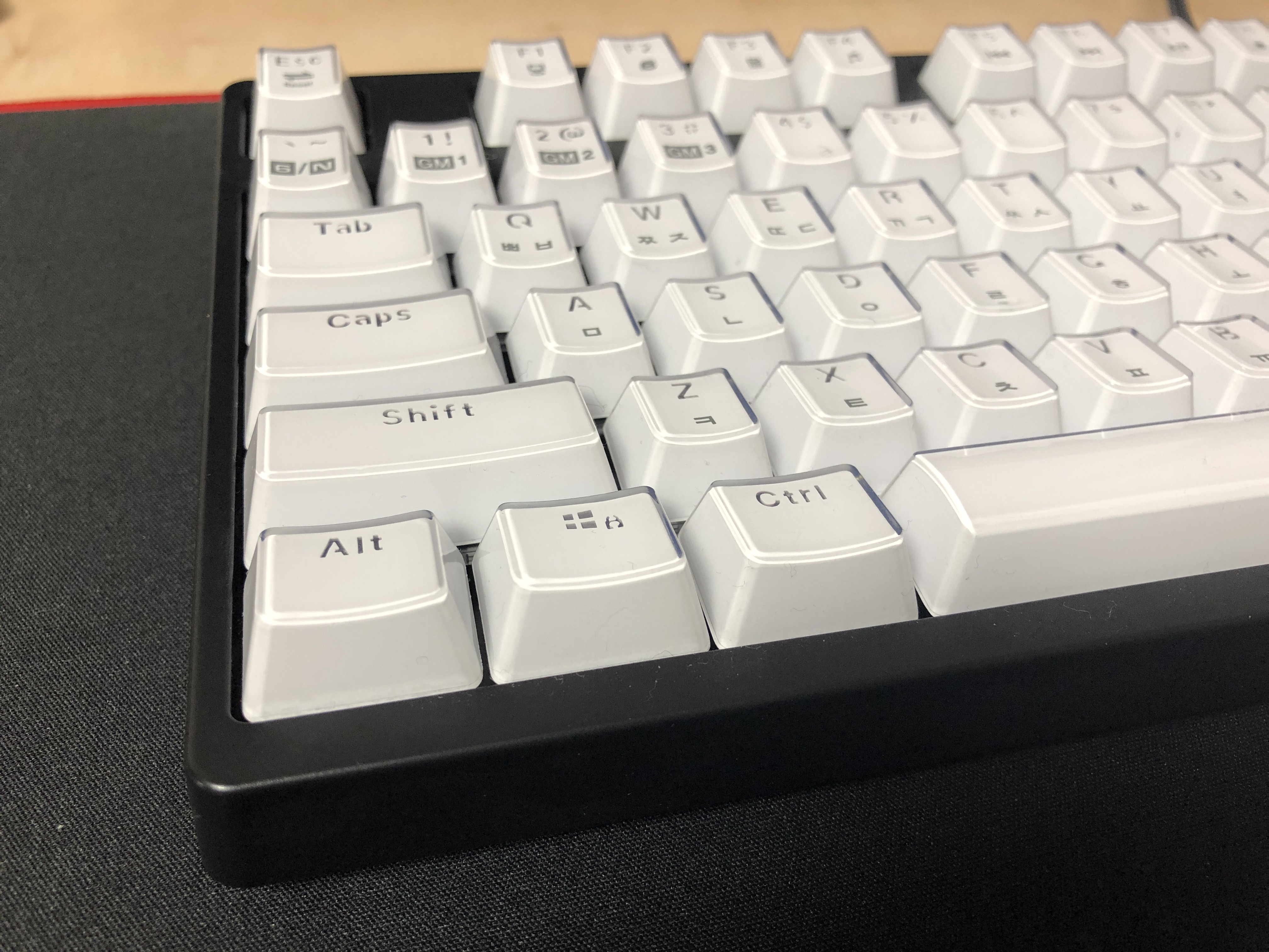 보통 ABS나 PBT재질의 플라스틱으로 키캡을 제작한다. ABS 보다 PBT가 더 비싸고 단가가 높다. 밀도가 높아 마모와 열에 강하기 때문이다. ABS와 PBT를 구분하는 방법은 물에 넣는 방법이다. ABS는 밀도가 낮아 물에 뜨고 PBT는 물속에 가라앉는다. 그나저나 플라스틱의 보석이라 불리는 투명 아크릴로 키캡을 마감하다니? 범상치 않다.