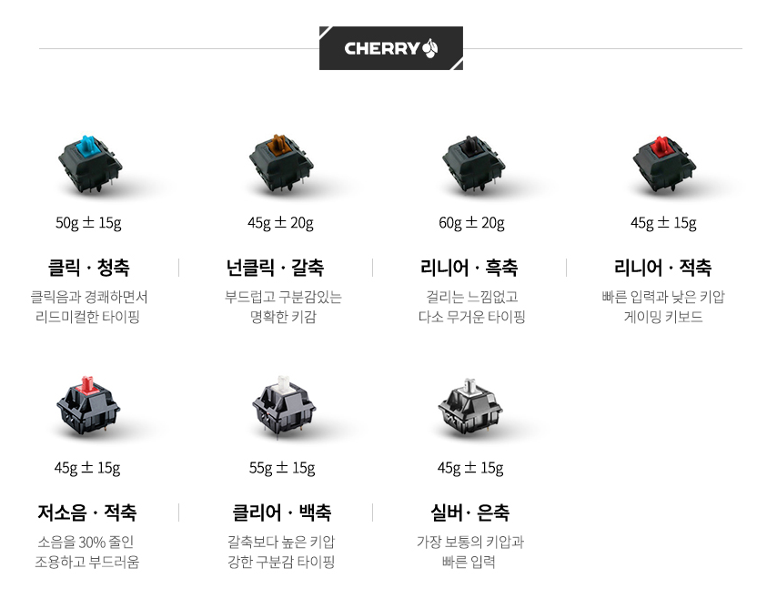 - 갈축(논클릭): 청축의 소음은 부담되고 기계식 키보드의 키감을 갖고 싶을때 좋다.