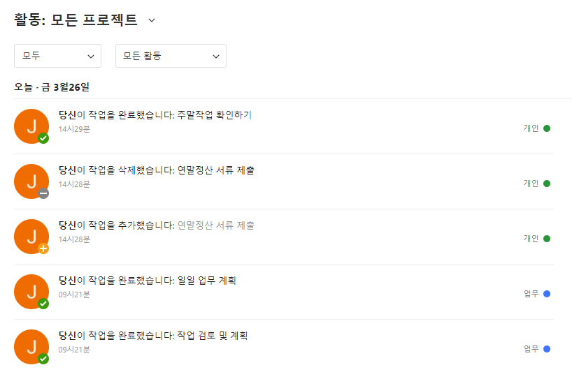 오늘 어떤 작업을 완료했는지 확인하는 것은 뿌듯함을 선사한다. 특히 완료된 작업에 취소선이 적용된 작업을 보았을 때의 그 뿌듯함이란. 하지만 Todoist에서는 완료된 작업을 바로 확인하기 어려우며 확인하기 위해서는 '활동 로그'내역을 확인하는 방법이 상당히 번거롭다.