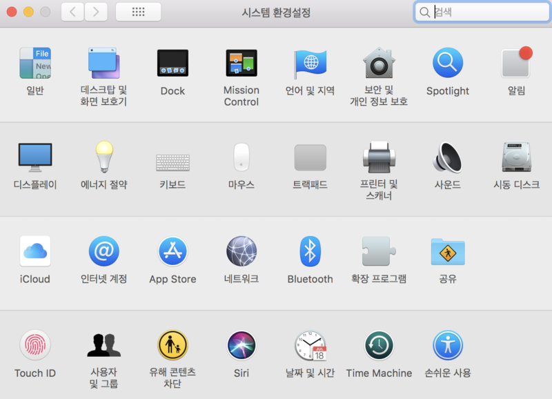 Mac OS의 설정은 매우 단순합니다. 아래의 윈도우 설정(제어판)과 Mac OS의 설정을 보면 알 수 있습니다. 심지어 각각의 설정 항목도 단순합니다.