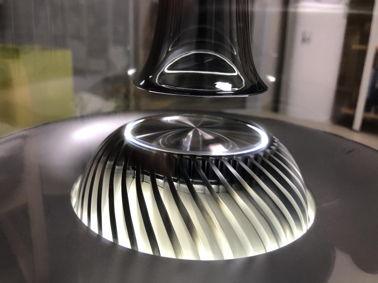 하만 카돈 오라 스튜디오 2는 인상 깊은 외형을 갖고 있습니다. 첫인상은 가습기처럼 생겼습니다. 밤에 불을 끄고 보면 수정구 느낌이 납니다. 핵심 부위는 검은 하판이며, 진공관처럼 생긴 부분이 울림통입니다. 검은 본체에 울림판이 붙었다고 생각하면 됩니다. 본체 바닥에는 손바닥 크기의 스피커가 있으며 옆부분에 나머지 스피커가 장착되어 있습니다. 진공관이라고 말씀드렸지만 '진공'은 아닙니다. 마치 아이스커피컵의 리드(뚜껑)처럼 생겼습니다. 위쪽 부분은 뚫려있습니다.